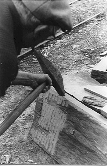 Première opération de délitage à l'aide d'un burin et d'un marteau: