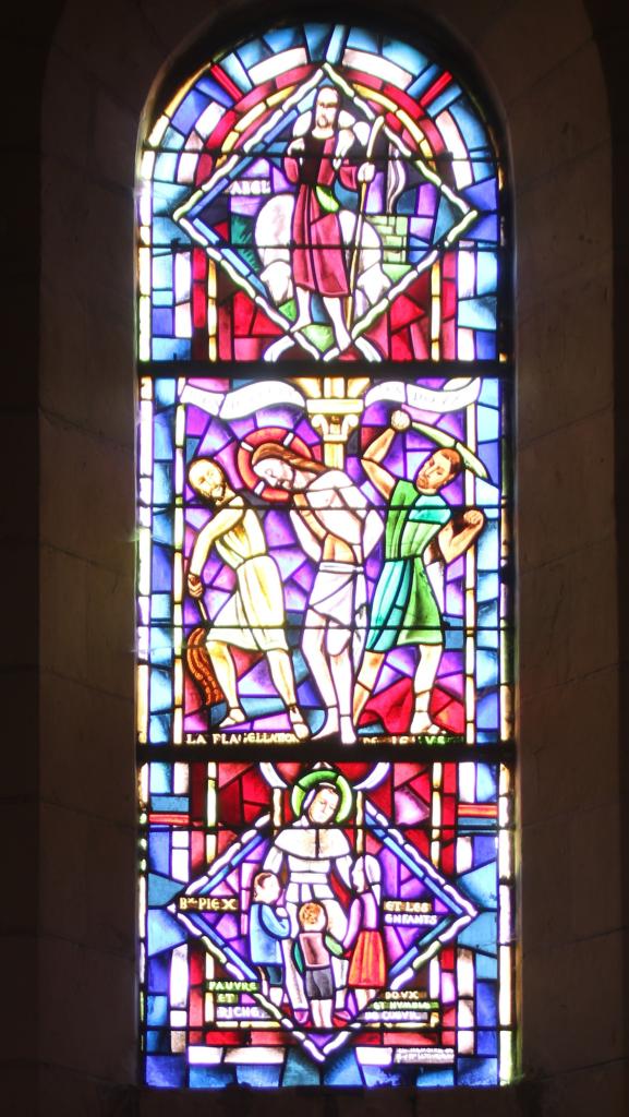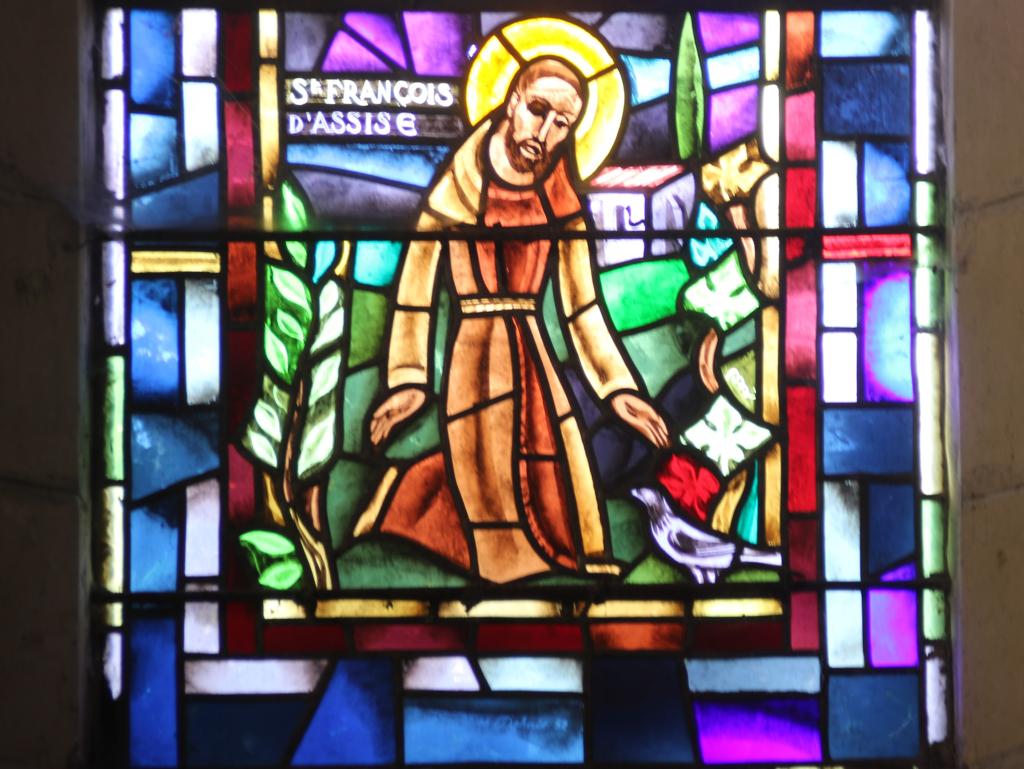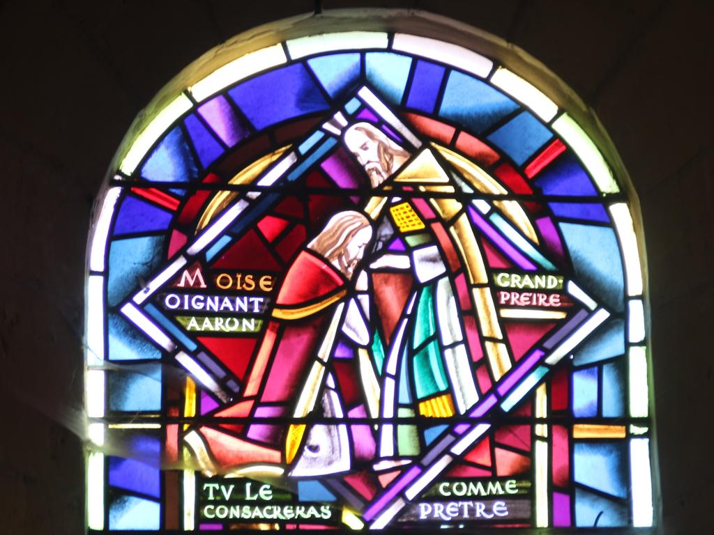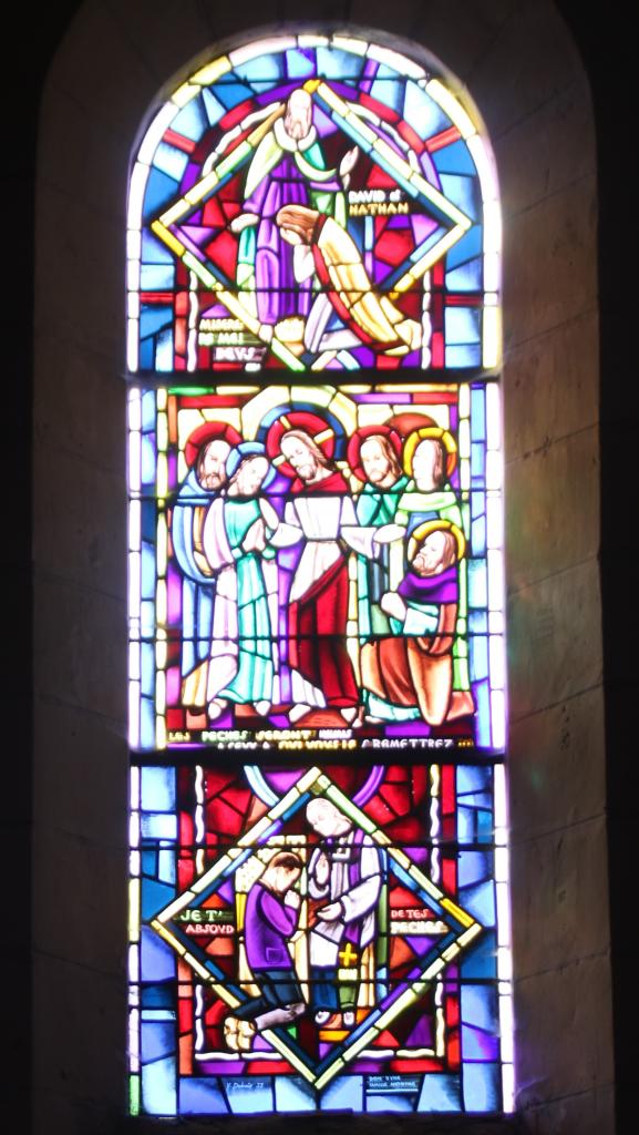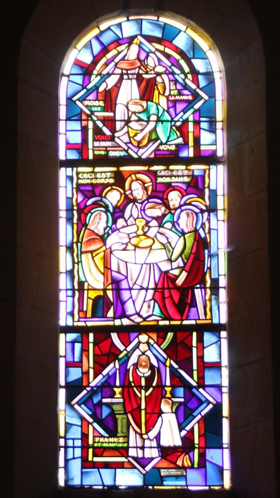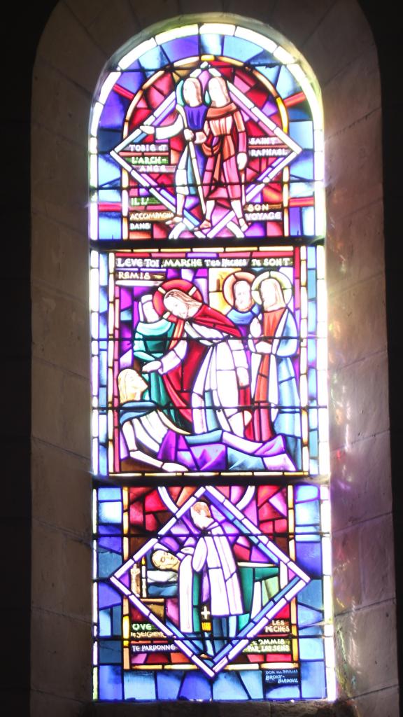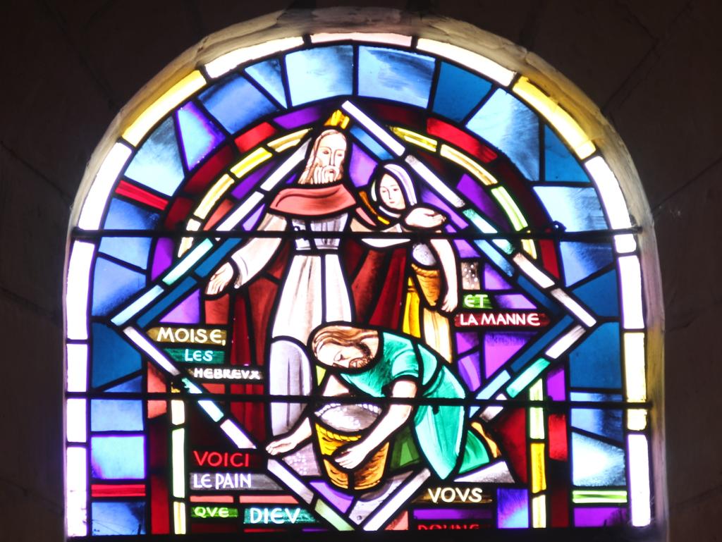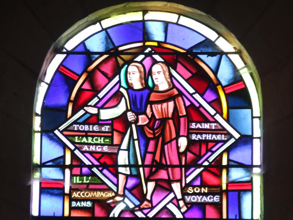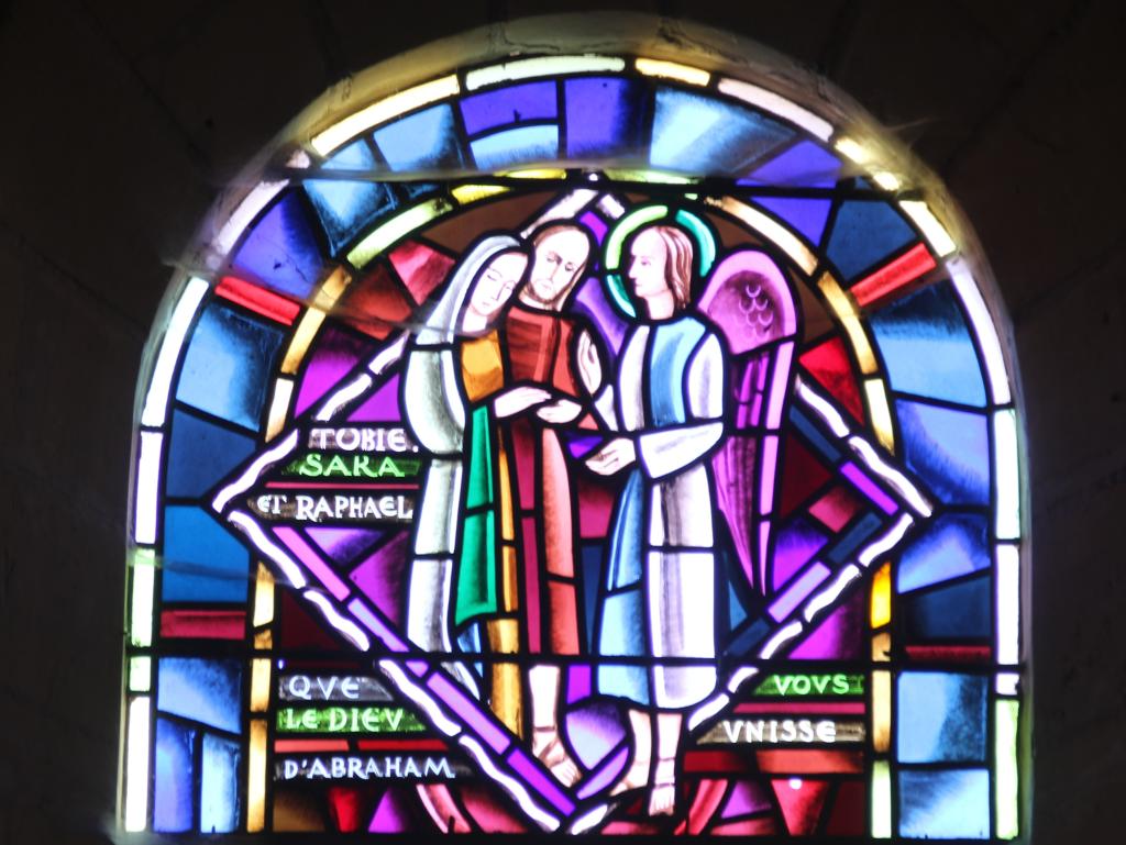 Des vitraux racontent des scènes de la bible et de la vie des saints. Les douze vitraux des bas-côtés présentent chacun un thème avec une superposition de trois scènes. En général, en bas des saints, au milieu le nouveau testament et en haut l’ancien testament. Les rayons de soleil leur donnent vie.