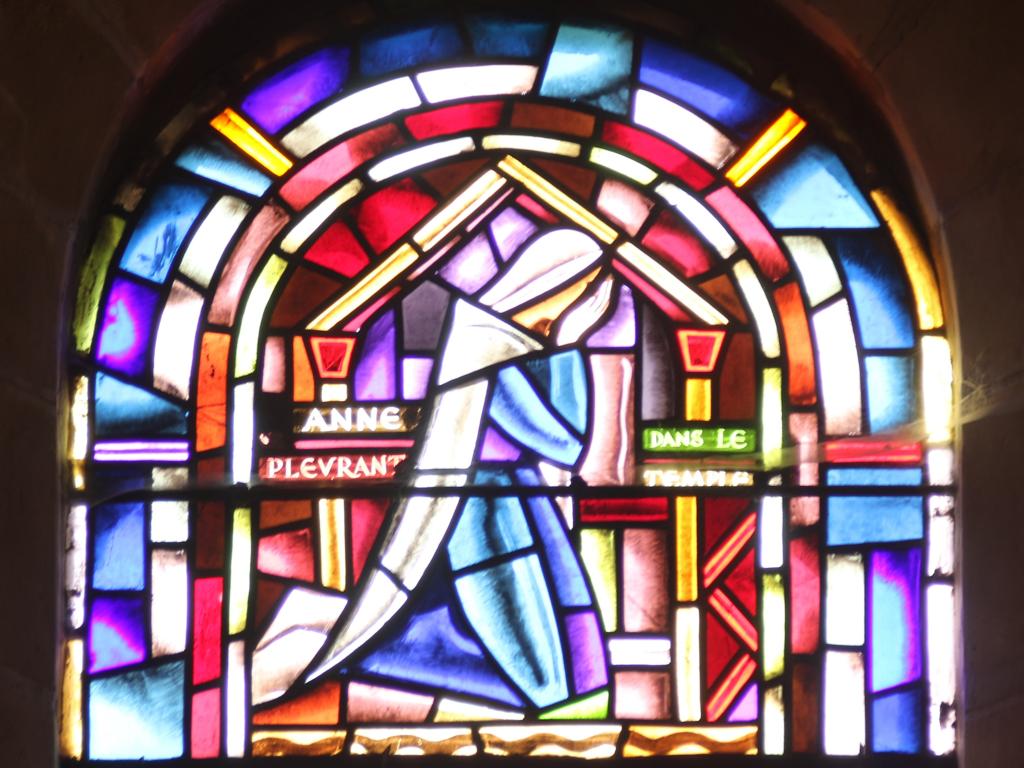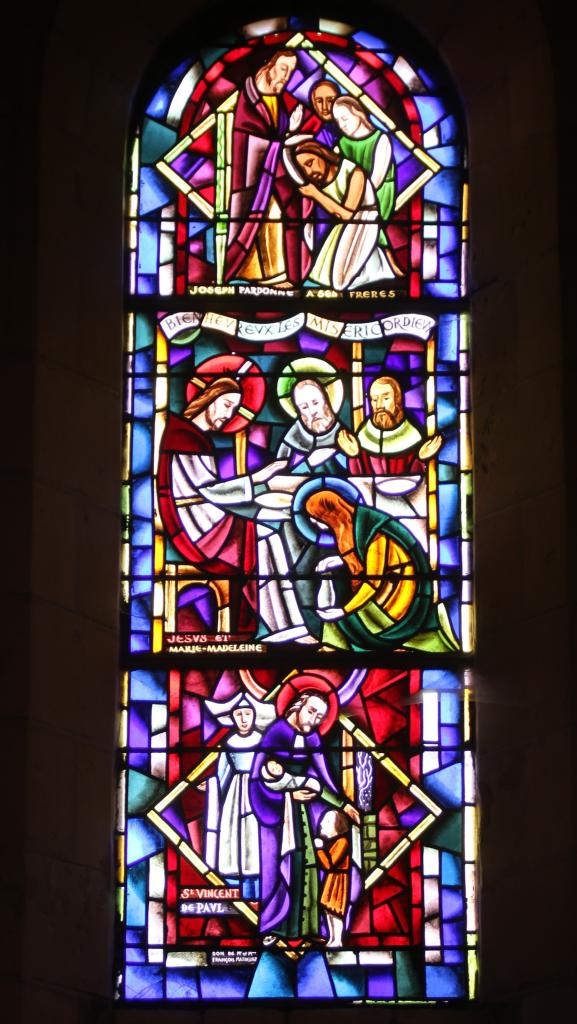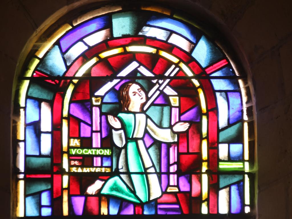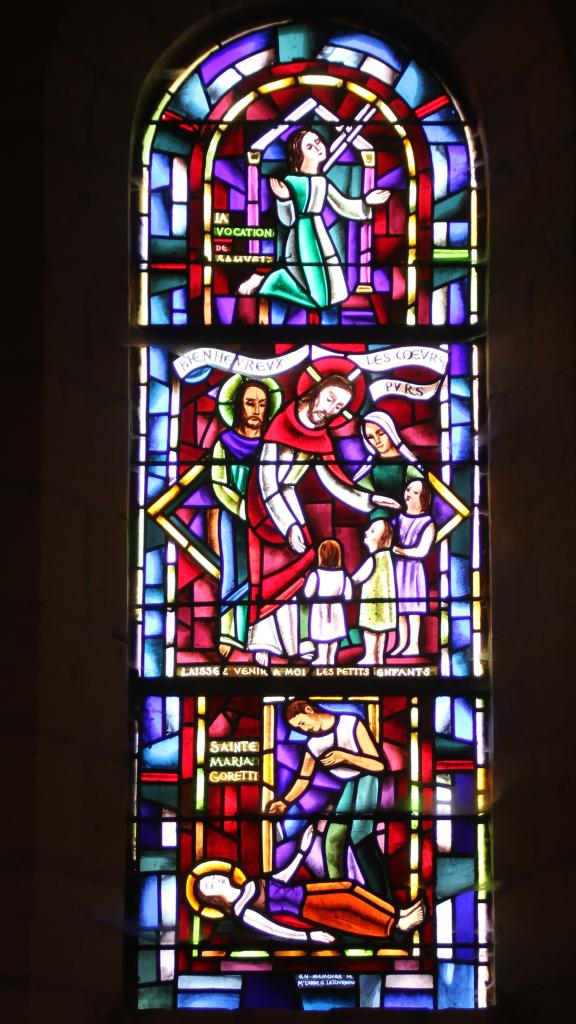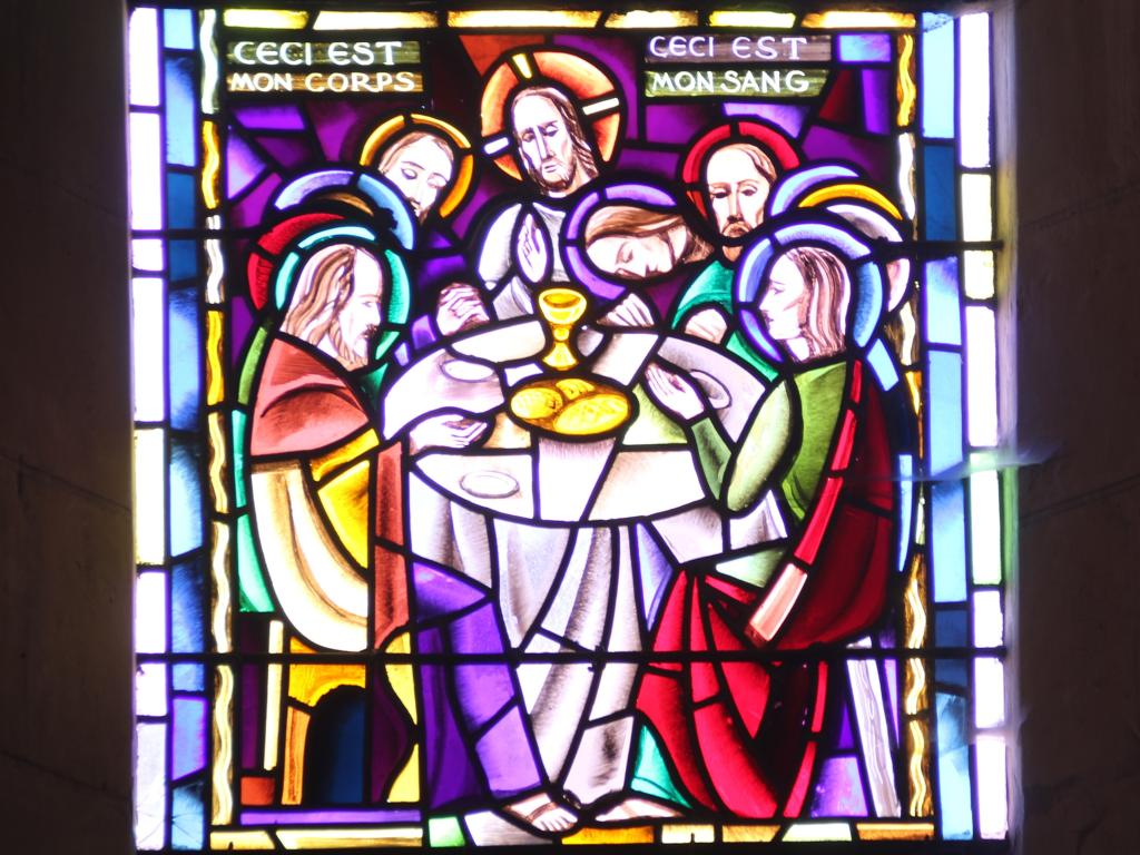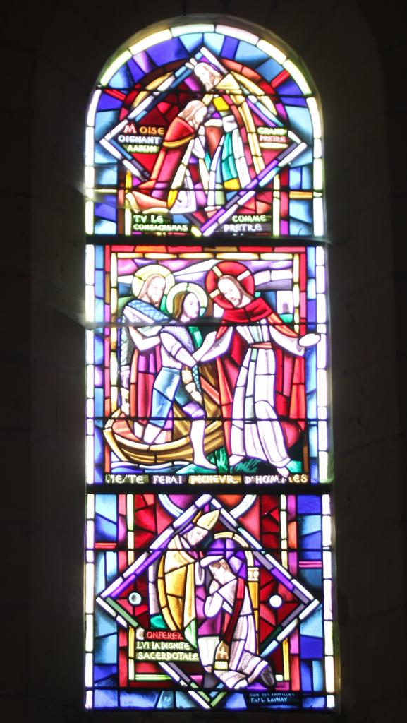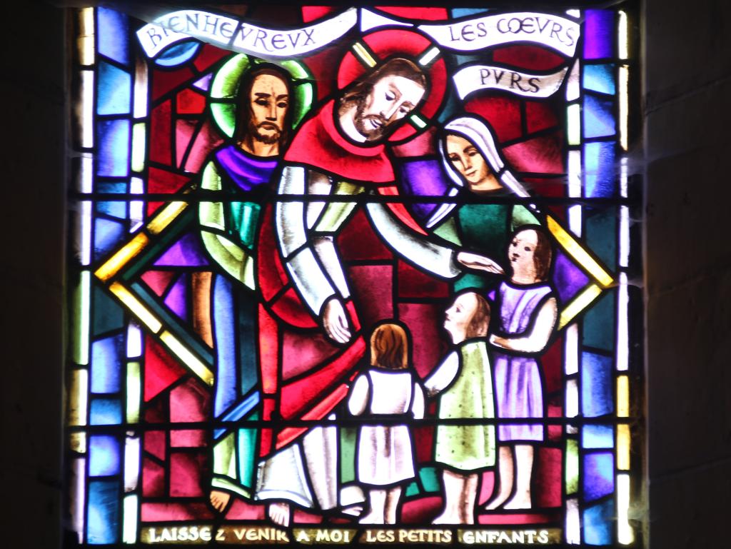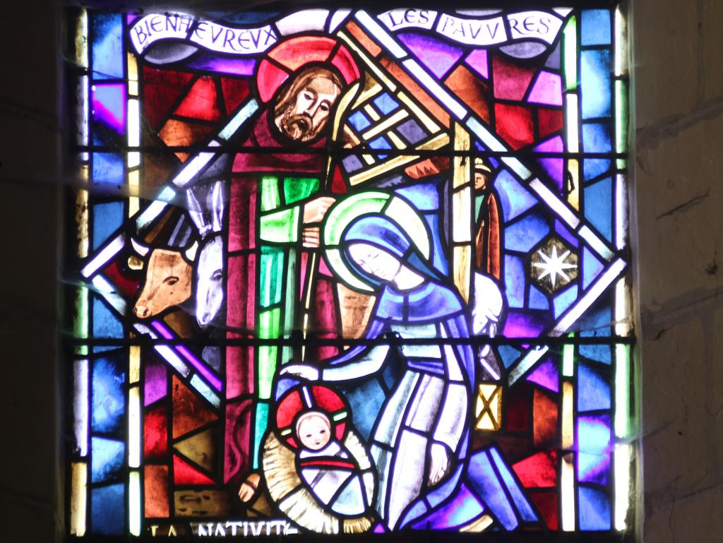Des vitraux racontent des scènes de la bible et de la vie des saints. Les douze vitraux des bas-côtés présentent chacun un thème avec une superposition de trois scènes. En général, en bas des saints, au milieu le nouveau testament et en haut l’ancien testament. Les rayons de soleil leur donnent vie.
