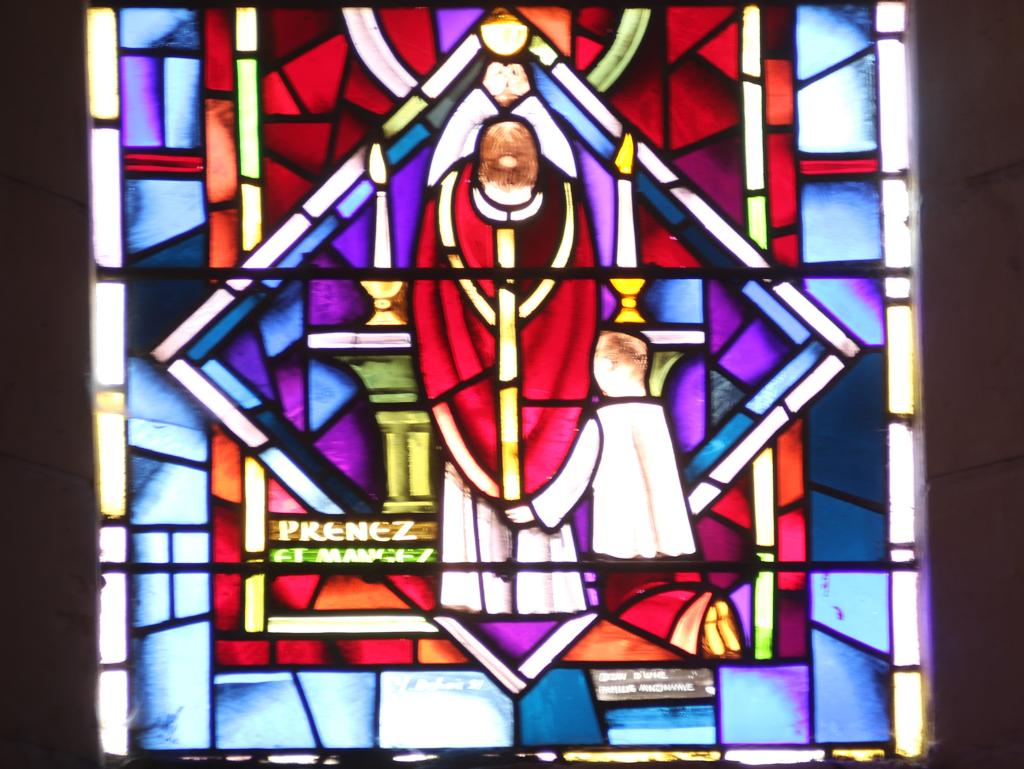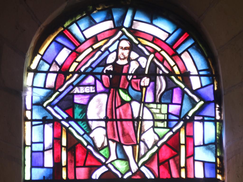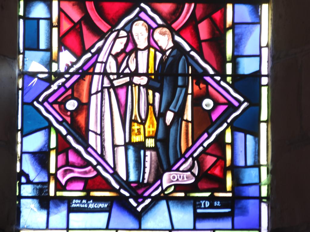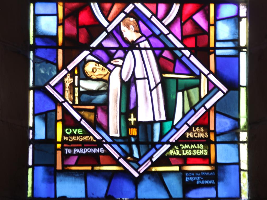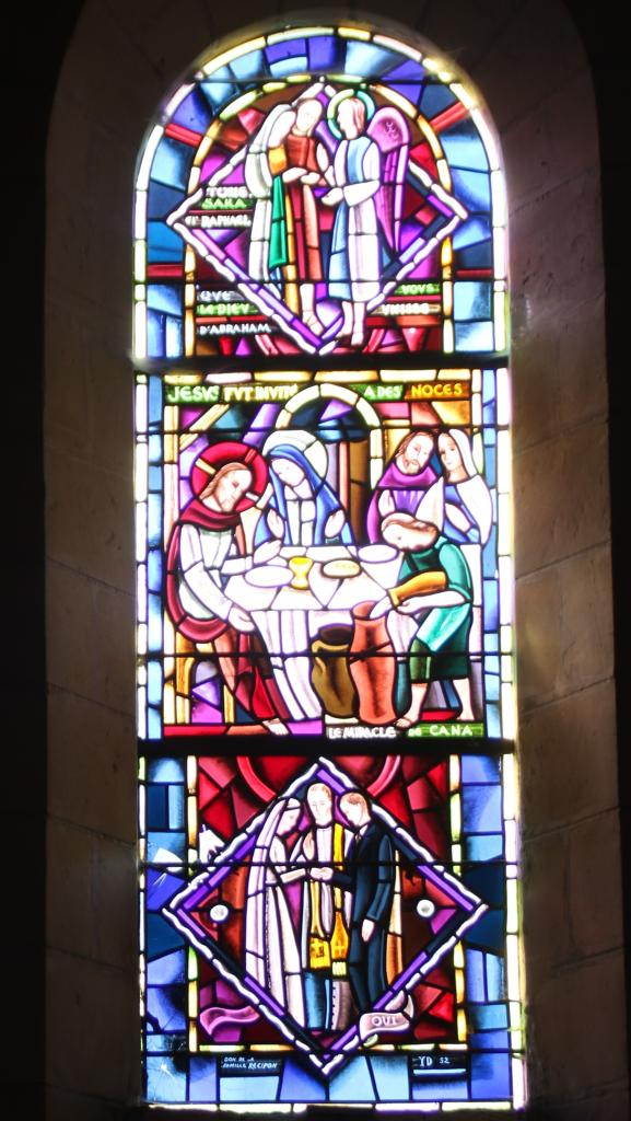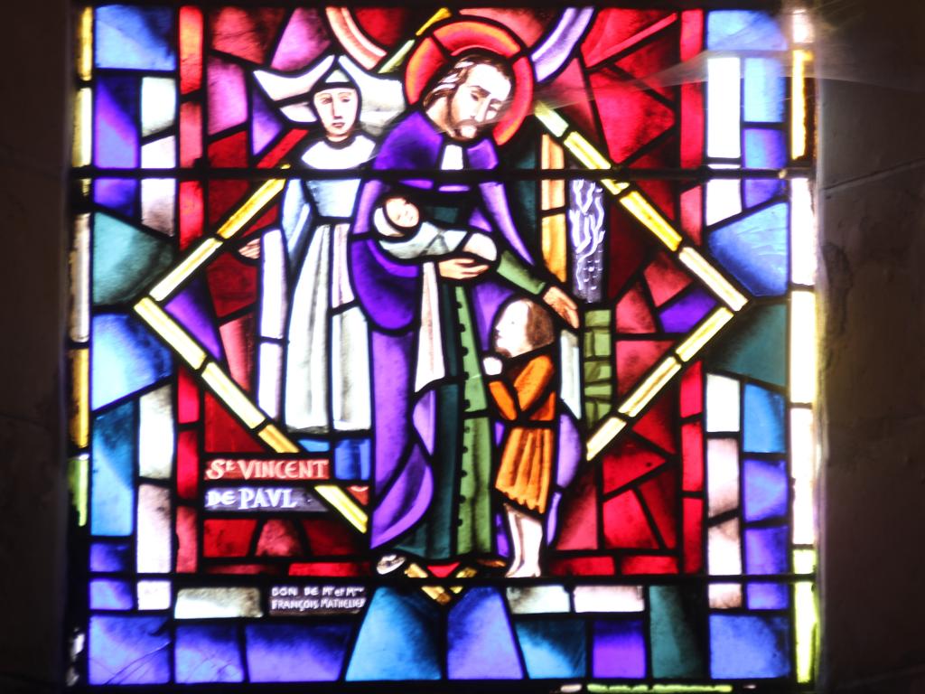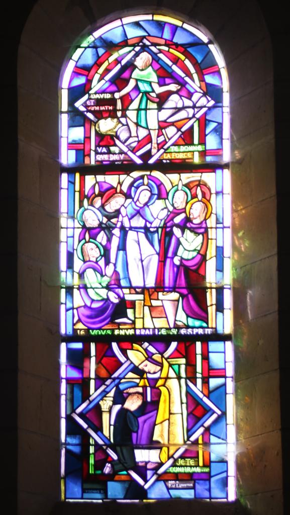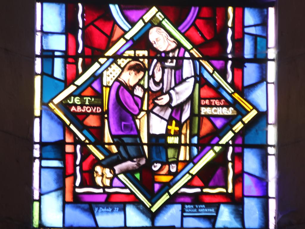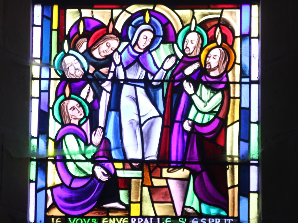 Des vitraux racontent des scènes de la bible et de la vie des saints. Les douze vitraux des bas-côtés présentent chacun un thème avec une superposition de trois scènes. En général, en bas des saints, au milieu le nouveau testament et en haut l’ancien testament. Les rayons de soleil leur donnent vie.
