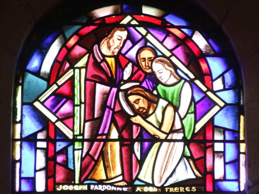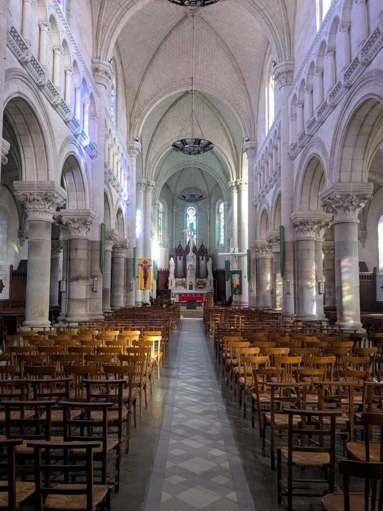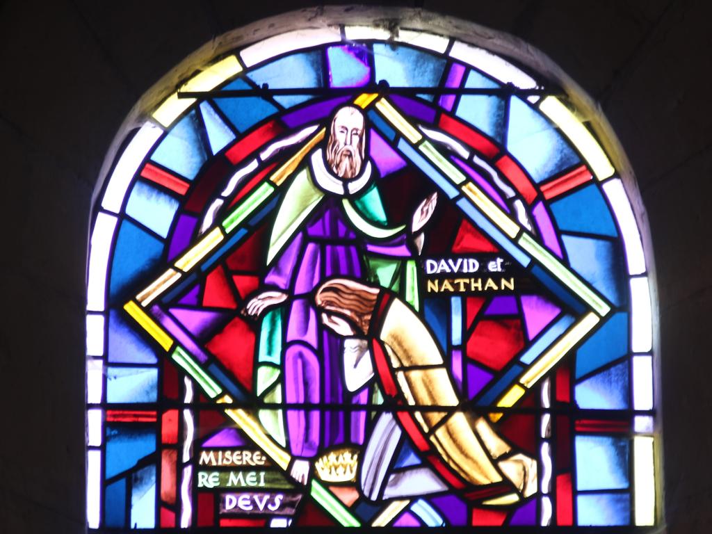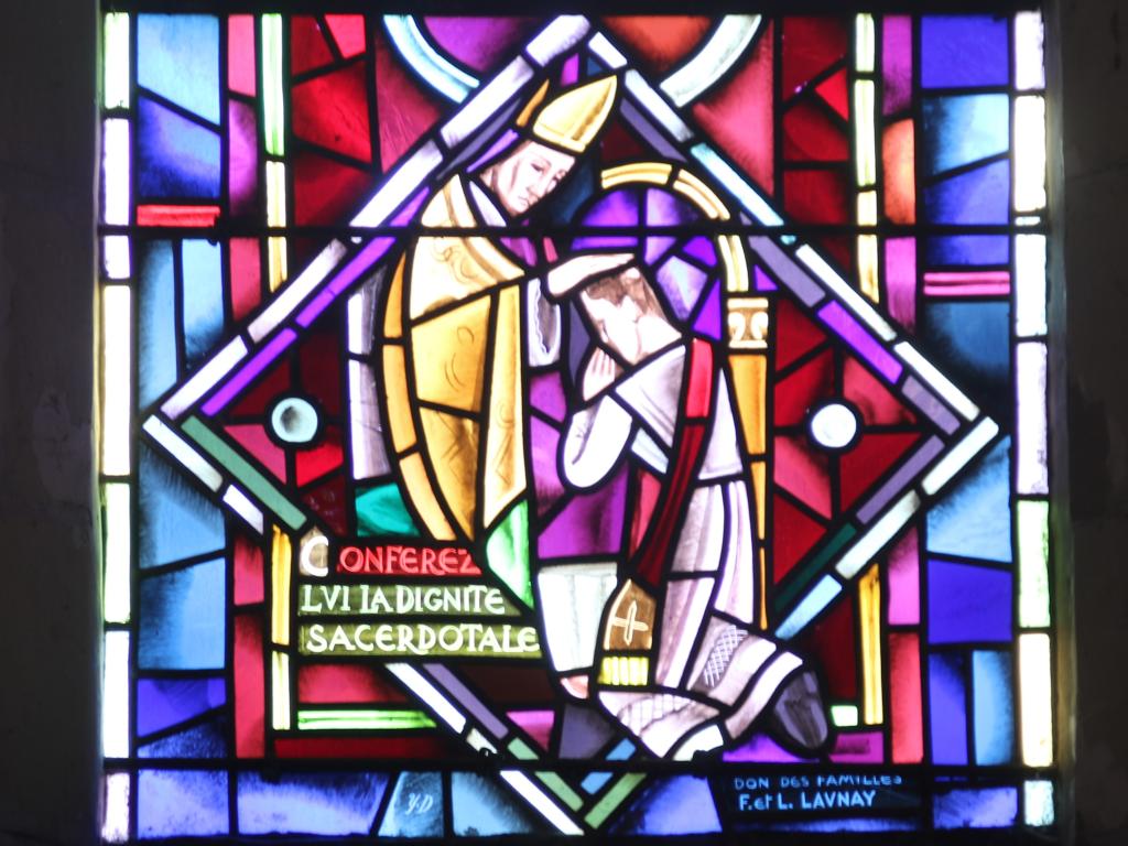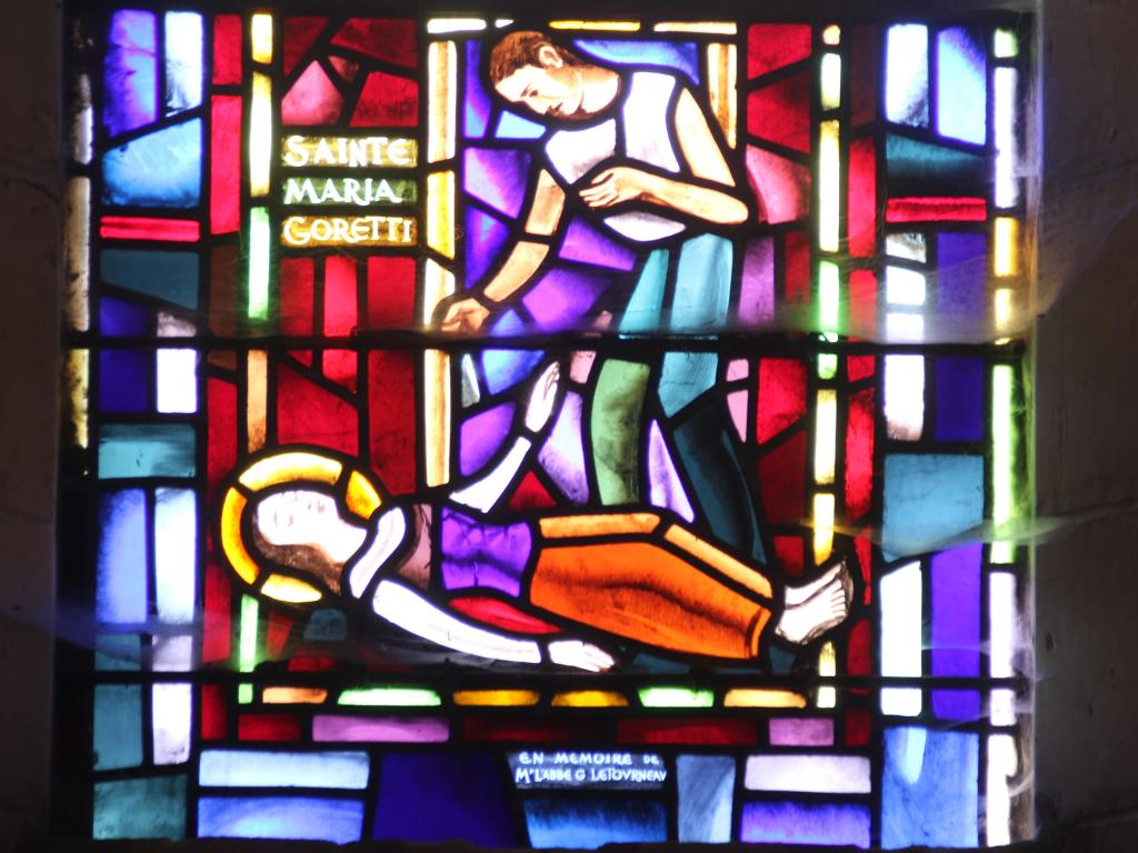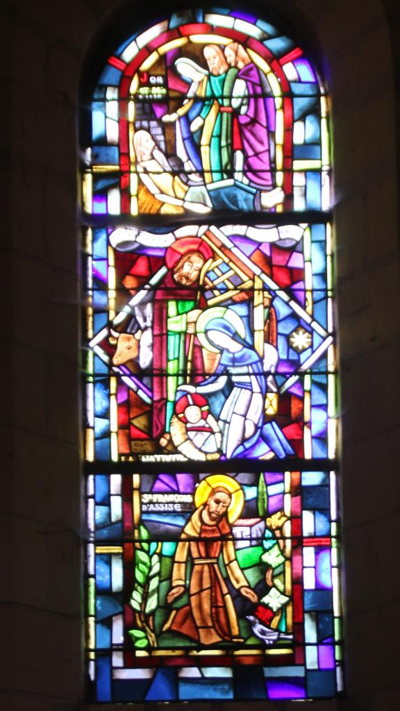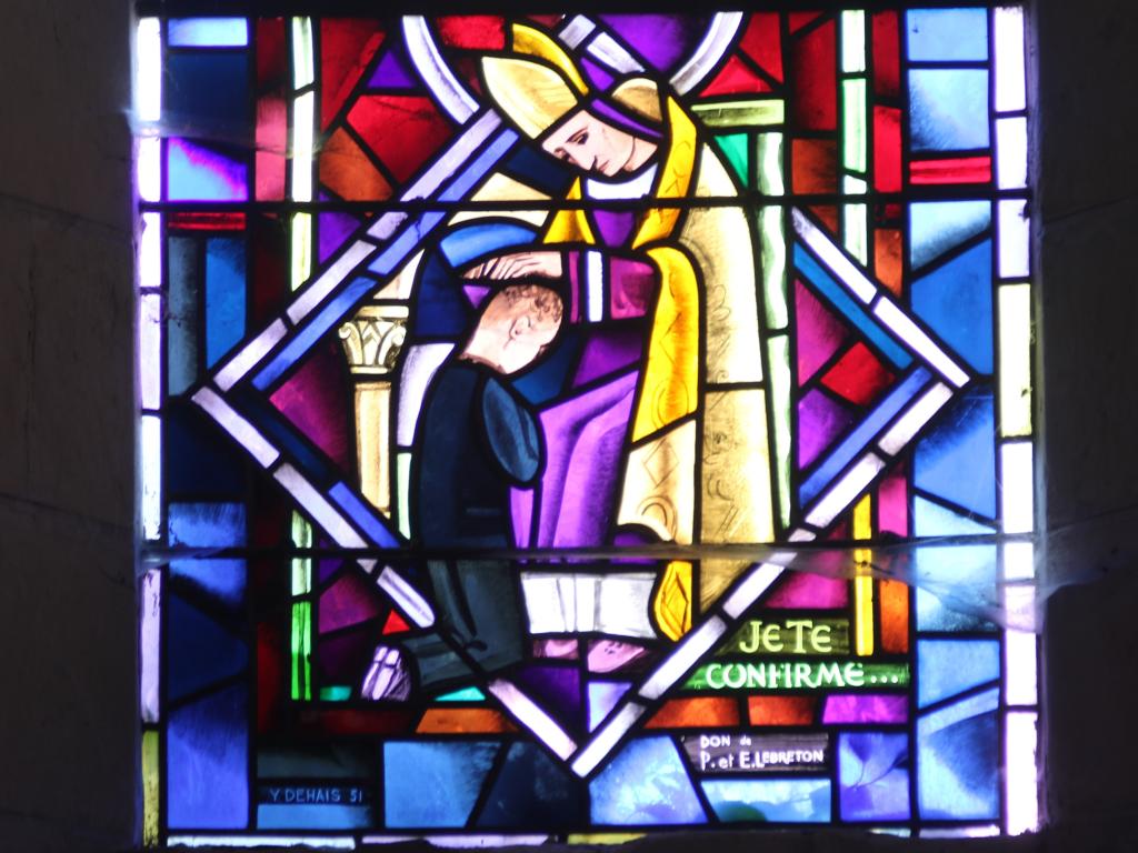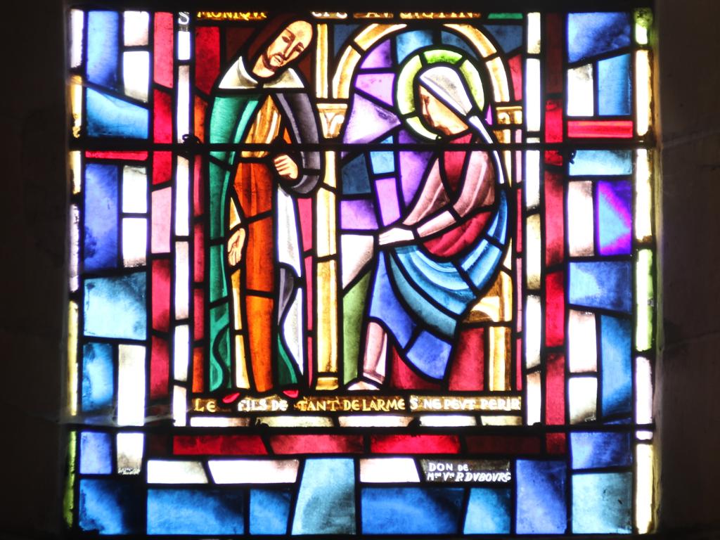 Des vitraux racontent des scènes de la bible et de la vie des saints. Les douze vitraux des bas-côtés présentent chacun un thème avec une superposition de trois scènes. En général, en bas des saints, au milieu le nouveau testament et en haut l’ancien testament. Les rayons de soleil leur donnent vie.